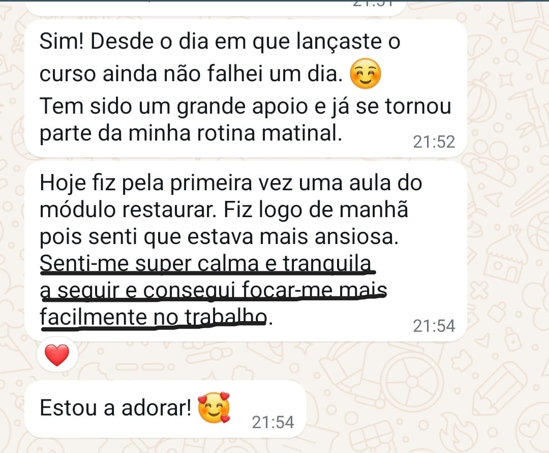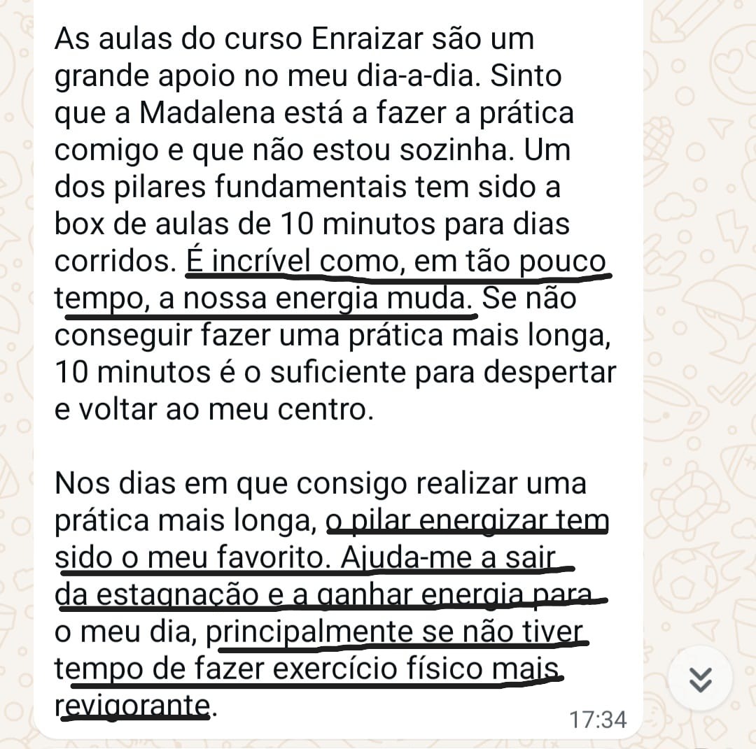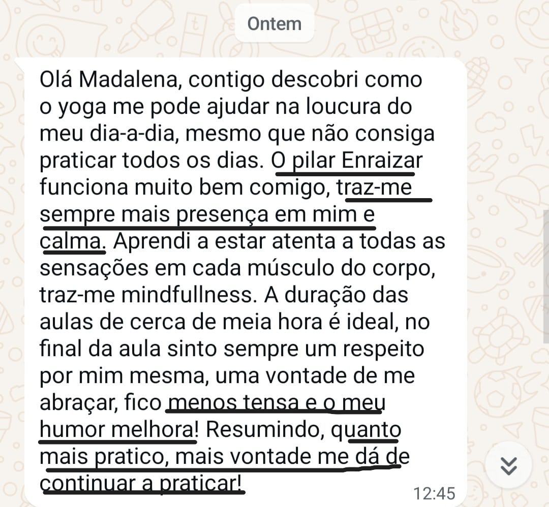 Com práticas curtas (15 a 20 minutos) de movimento consciente, respiração e relaxamento, vais sentir o teu corpo mais leve, a tua mente mais calma e a tua energia mais disponível para te sustentares ao longo da rotina.